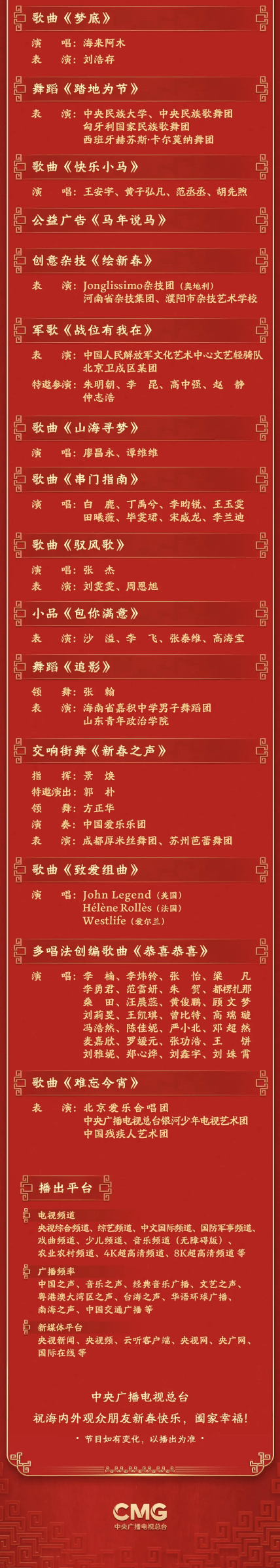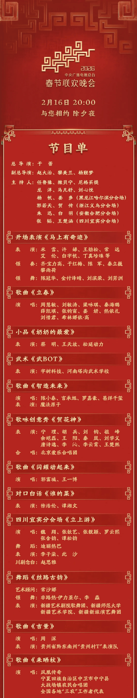 从温情慢歌到劲歌热舞,从国风古韵到国际风情,今晚的央视春晚舞台,歌声与掌声将交织成最美的新春祝福。百位群星将用他们的歌声,陪伴全球华人度过一个难忘的除夕之夜,在音律中迎接马年的到来。