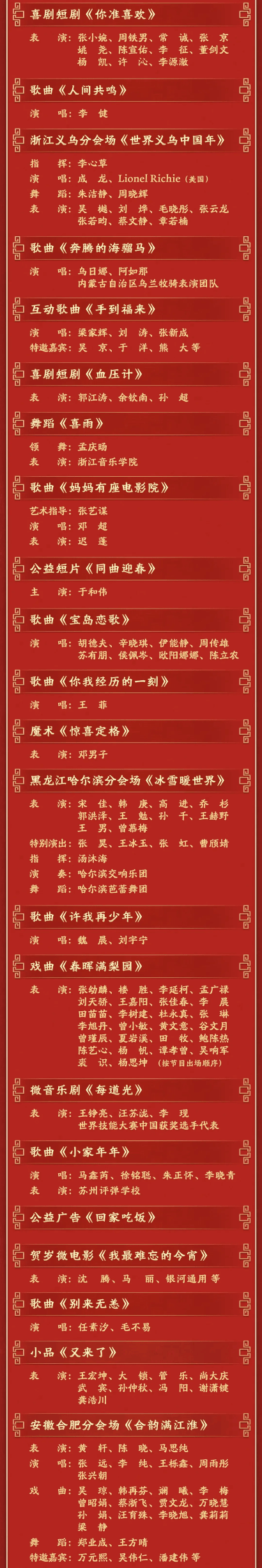本届春晚的参演阵容堪称 “众星云集”,既有承载一代人青春记忆的老牌艺人和实力唱将,也有当下炙手可热的新生代偶像,更有重量级国际嘉宾加盟。郭富城、陈小春、苏有朋、周传雄、辛晓琪等港台地区艺人悉数登场,王菲、李健、张杰、谭维维、周深、毛不易、凤凰传奇等内地实力唱将坐镇,带来万里挑一的音乐舞台。此外,还有王铮亮、汪苏泷和李现带来的微音乐剧《每道光》。